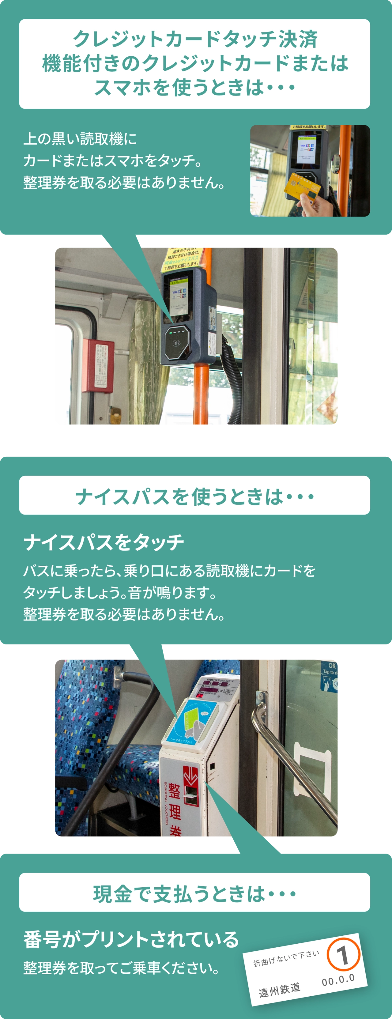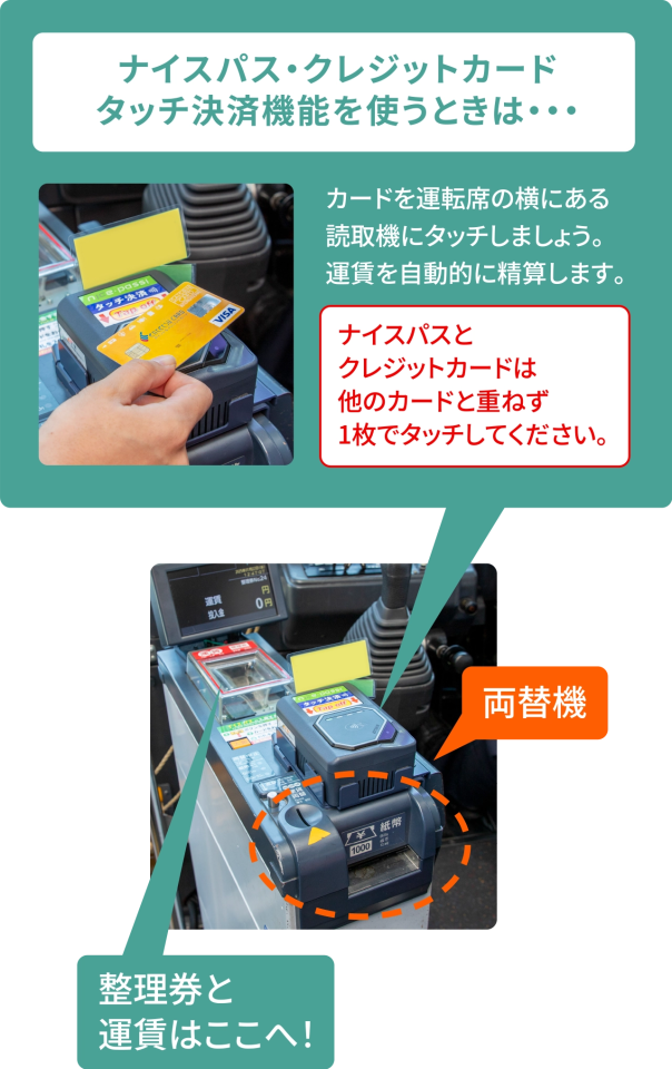 後ろドアから乗車し、専用の読取機にナイスパスまたはクレジットカードタッチ決済機能付きのクレジットカード、スマホをタッチ。